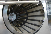 由電機(jī)帶動(dòng)中間軸上的鏈輪旋轉(zhuǎn)從而帶動(dòng)滾筒的旋轉(zhuǎn),滾筒上有三個(gè)大法蘭,由六個(gè)托輪支撐,滾筒速度可由電機(jī)作調(diào)整。滾筒內(nèi)壁裝有導(dǎo)料長(zhǎng)條,滾筒內(nèi)有噴淋水管,下方有兩個(gè)水箱,進(jìn)料方噴淋管的水來(lái)自出料邊水箱,此水采用循環(huán)水;出料處的噴淋水來(lái)自進(jìn)料邊的水箱,此水是清水。
